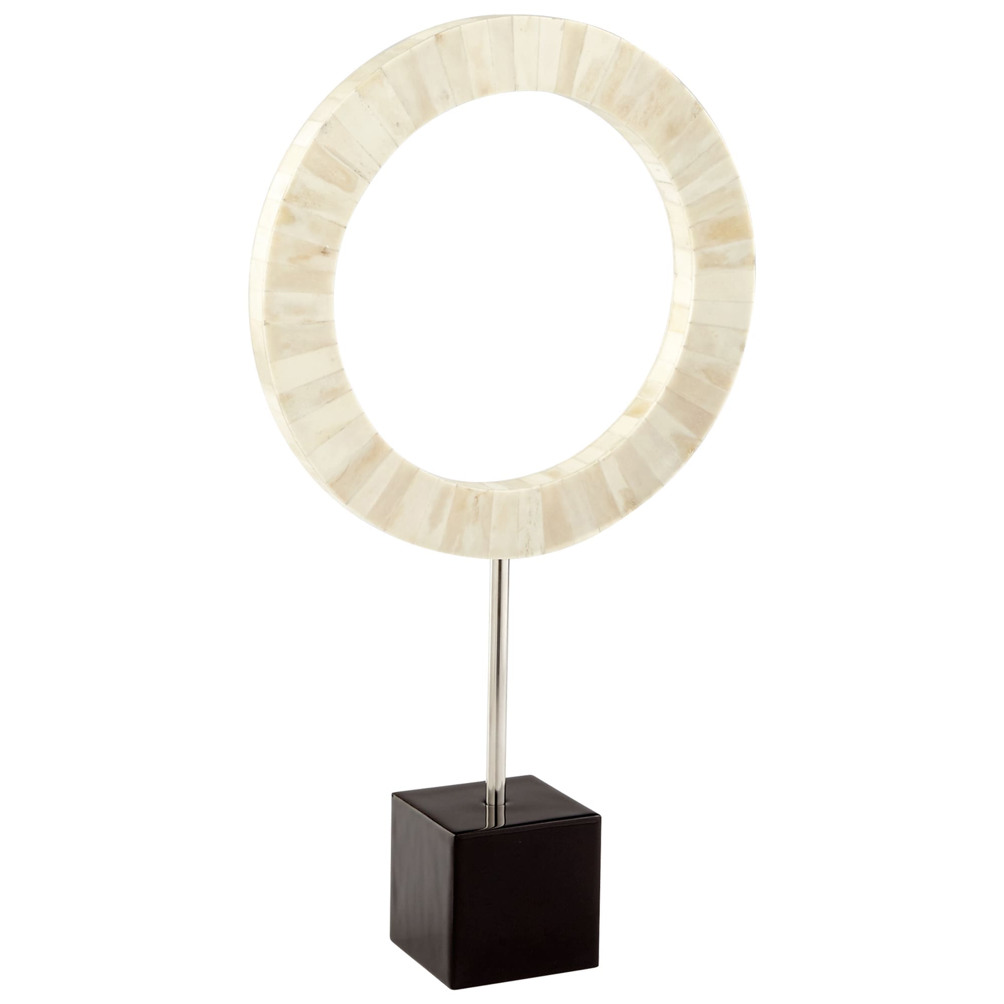 The Bone Ring Sculpture is a mosaic blend of white bone turned into a perfectly round sculpture sitting atop a black square cube. The Mosaic Circle is made of natural white bone and is securely fastened to the base with a modern stainless steel rod. The White Bone Mosaic Ring Sculpture offers dimension to a desk or table top and comes in three impressive sizes. Use the White Bone Sculpture in staggering heights on a dining table or mantle. The White Bone Circle gives contrast to the black square base, adding texture to your space. The White Bone Mosaic Sculpture is a classic design made modern with unexpected materials. This intriguing sculpture is an elegant way to add a decorative element to your book case or floating shelves. Available in three heights; price shown is for one sculpture.