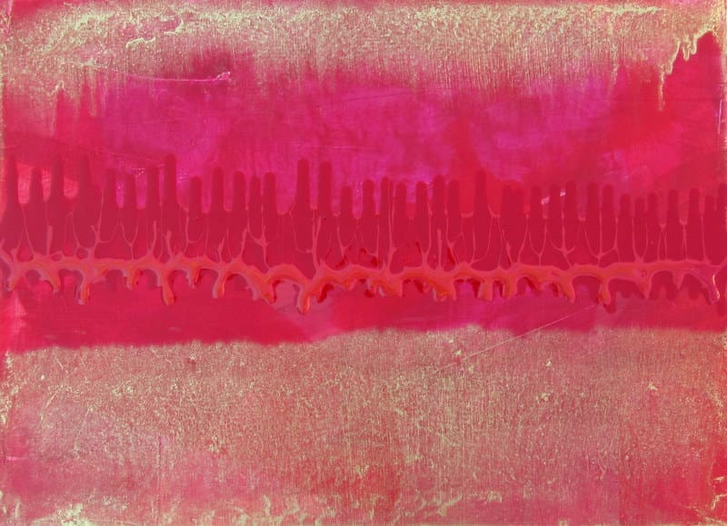 From his Color Saturation Series, Austin Allen James brings us “Cranberry.” This energetic abstract painting features washes of cranberry, red and fuchsia, with touches of metallic gold. A dense horizon line invites movement and lyricism to the piece, for which the artist is well known. This mixed media painting on board is coated with a resin clear coat to preserve and enhance the complex layers of this one of a kind abstract. The glossy surface invites the viewer to experience the artwork “through a looking glass.” This colorful painting can easily serve as the foundation of a well appointed roomscape. Choose the “Cranberry” style in the size of your choosing, with a 2″ depth. Each painting is made to order as a one of a kind commission; inherent variations make each piece it’s own unique treasure. Contact us for custom sizes, available at 1 dollar per square inch. Learn more about the artist in his feature as a Moss Manor 2014 Guest Curator.