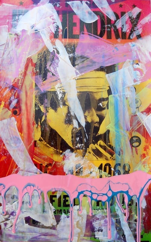 From his Icon Art Series, Austin Allen James brings us “Jimi.” This icon collage painting features a photo of Jimi Hendrix. Regarded as one of the greatest instrumentalists in history, Hendrix’s music has inspired many, one of which is James. Layers of pink, blue, and white paint invite movement and lyricism to the piece, for which the artist is well known. You can almost feel the electricity of the music through the piece. This mixed media painting on poster is coated with a resin clear coat to preserve and enhance the complex layers of this one of a kind abstract. The glassy surface invites the viewer to experience the artwork through a “looking glass.” This colorful pop art painting can easily serve as the foundation of a well appointed roomscape. Choose the “Jimi” style in the size of your choosing, with a 2″ depth. Each painting is made to order as a one of a kind commission; inherent variations make each piece it’s own unique treasure. Contact us for custom sizes, available at 1 dollar per square inch. Learn more about the artist in his feature as a Moss Manor 2014 Guest Curator.