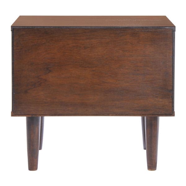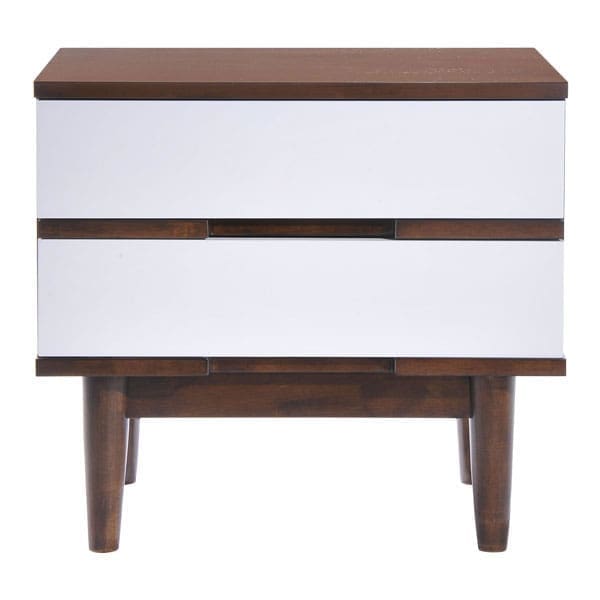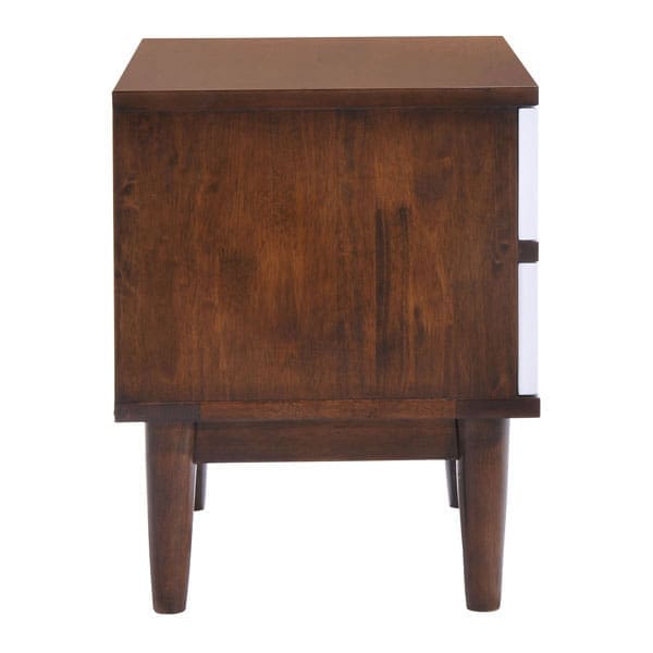 The LA Night Stand is as chic and cool as Los Angeles itself. Crafted of solid rubberwood with a walnut wood veneer, this modern side table has clean lines and mid-century modern appeal. The LA Night Stand features two white painted drawers that fit seamlessly into the cabinet with recessed pulls. The top, sides and back of the cabinet are finished in a contemporary walnut stain. This unique night stand is excellent for storage in the bedroom or living room. Choose this piece to coordinate with your sensible modern decor. The LA Collection also features a double dresser, a high chest of drawers, a mirror, and king and queen size beds.