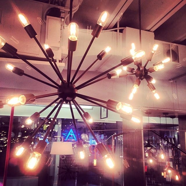 The Large Sapphire Light Fixture is a showstopper. The industrial design is a tribute to the mid-century space race. The long metal arms of the Large Sapphire Light Fixture suspend light in every direction. This contemporary light fixture would be an excellent choice for a foyer, living room, dining room or bedroom.  The twenty bulbs give off ample lighting for large spaces, yet still conserves energy with a 25 watt bulb. Install it with a dimmer switch for the ultimate ambience. For a smaller space, or to group multiple sizes, also consider the Small Sapphire Light Fixture. FINAL SALE.