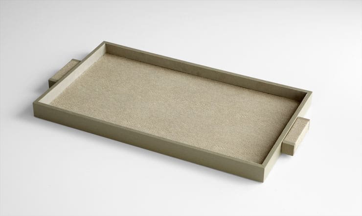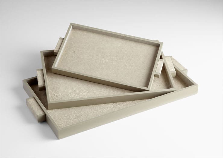 The Melrose Shagreen Leather Trays are the epitome of sophistication. Wrapped in elegant taupe faux shagreen leather, the Melrose Trays are perfect for displaying books, choice accessories and decorative objects on your tabletop. Layer your coffee table or ottoman for a living room focal point. Or add candles or vases for a dining table centerpiece. Create the ultimate work station in your office with this elegant catchall. Choose from small, medium or large for the perfect accompaniment. The finely crafted, clean lines of the Melrose Shagreen Leather Trays are sure to lend sophisticated style to your contemporary home or office. For a square shape, consider the Brooklyn Shagreen Leather Trays.