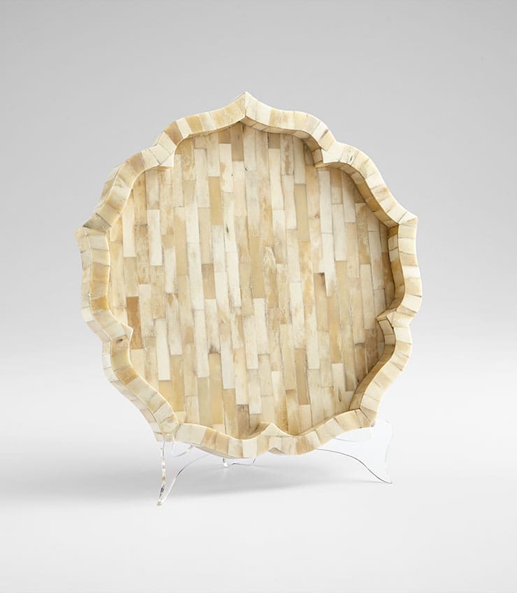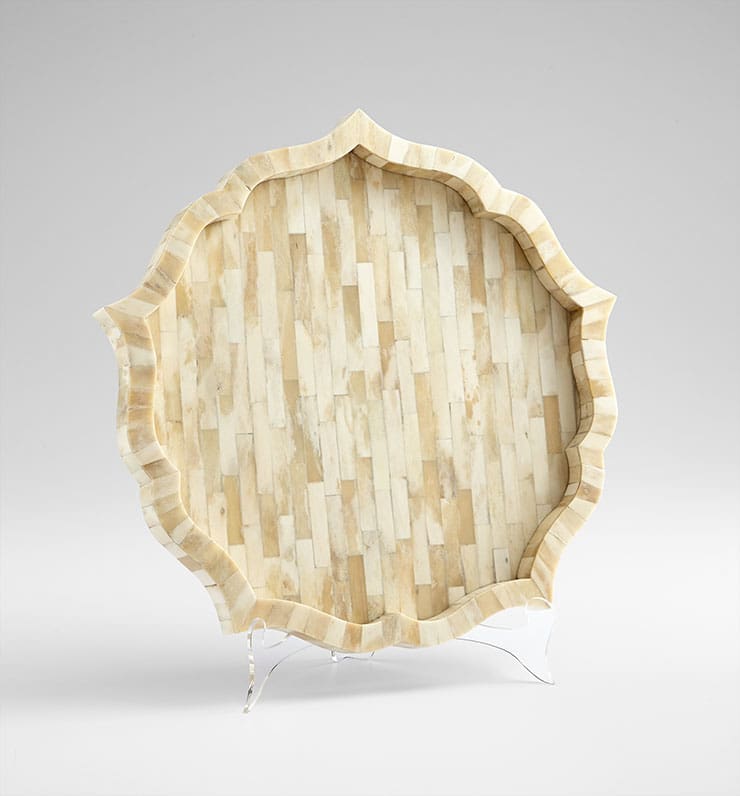 The Mirage Tray Collection adds an element of grandeur to any tabletop or shelf. Finely crafted of bone and wood with a natural or blue finish with a mosaic pattern, these traditional geometric serving trays are are uniquely fetching. Choose one Mirage Tray as stand alone statement piece or group them together for a creative display. Or use these decorative trays to create texture and interest in a unforgettable centerpiece arrangement.