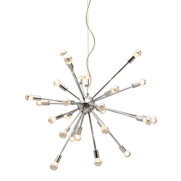 Let there be light. The Physics Ceiling Lamp is a stunning modern light fixture featuring twenty five bulbs dipped in chrome. At 15 watts each, the bulbs emit a soft glow, which en masse create a gracefully illuminated environment. The Physics Ceiling Lamp radiates with varying length arms from a central chrome core  suspended on a cable with a matching ceiling plate. The chandelier’s generous scale makes it perfect for a variety of environments, including a living room, dining room, bedroom, or large entry. Like a rare sputnik, the Physics Ceiling Lamp is sure to lend a modern atmosphere to your home or office.