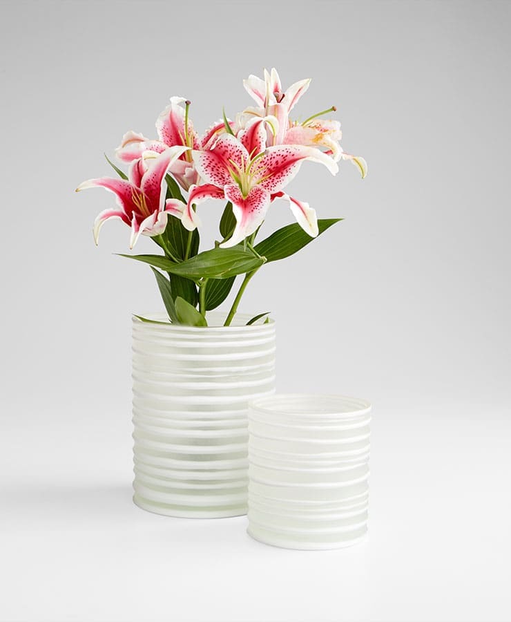 The St. Vincent Vase Collection is simple and dramatic all at once. Crafted of glass with a white finish, these modern vases are understated and beautiful. The St. Vincent Vase Collect has a simple cylinder shape that is short in stature with stripes of white adorning each vase. Choose one for an exceptional accent piece, or group them together for a classic collection. Fill them with seasonal flowers or greenery, or use them as a focal point in a centerpiece arrangement. FINAL SALE.