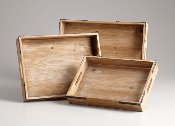 The Staton Trays are industrial and rustic. Finely crafted of hardwood with a washed oak finish and iron accents along its joints, these trays are perfect for displaying books, choice accessories and decorative objects on your tabletop. Layer your coffee table or ottoman for a living room focal point. Or add candles or vases for a dining table centerpiece. Create the ultimate work station in your office with this arcadian catchall. The Staton Tray set includes three sizes for the perfect accompaniment. The finely crafted, clean lines of the Staton Trays are sure to lend a natural unfinished style to your home or office.