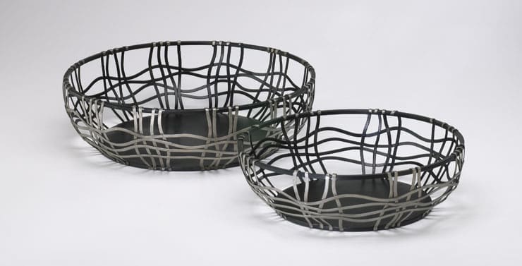 The Suzanne Baskets are modern and contemporary. Crafted of iron with a silver and bronze finish, these baskets feature a wavy woven pattern and elongated shape. Choose this set for a stylish storage solution. Use one for a creative focal point, or group them together for a charming display. Fill them with choice accessories, or use them in the kitchen as storage solutions. Each of these containers can easily stand alone as a decorative objet d’art. The Suzanne Baskets are an excellent gift for the sophisticated hostess, or for your own contemporary tabletop decor.
