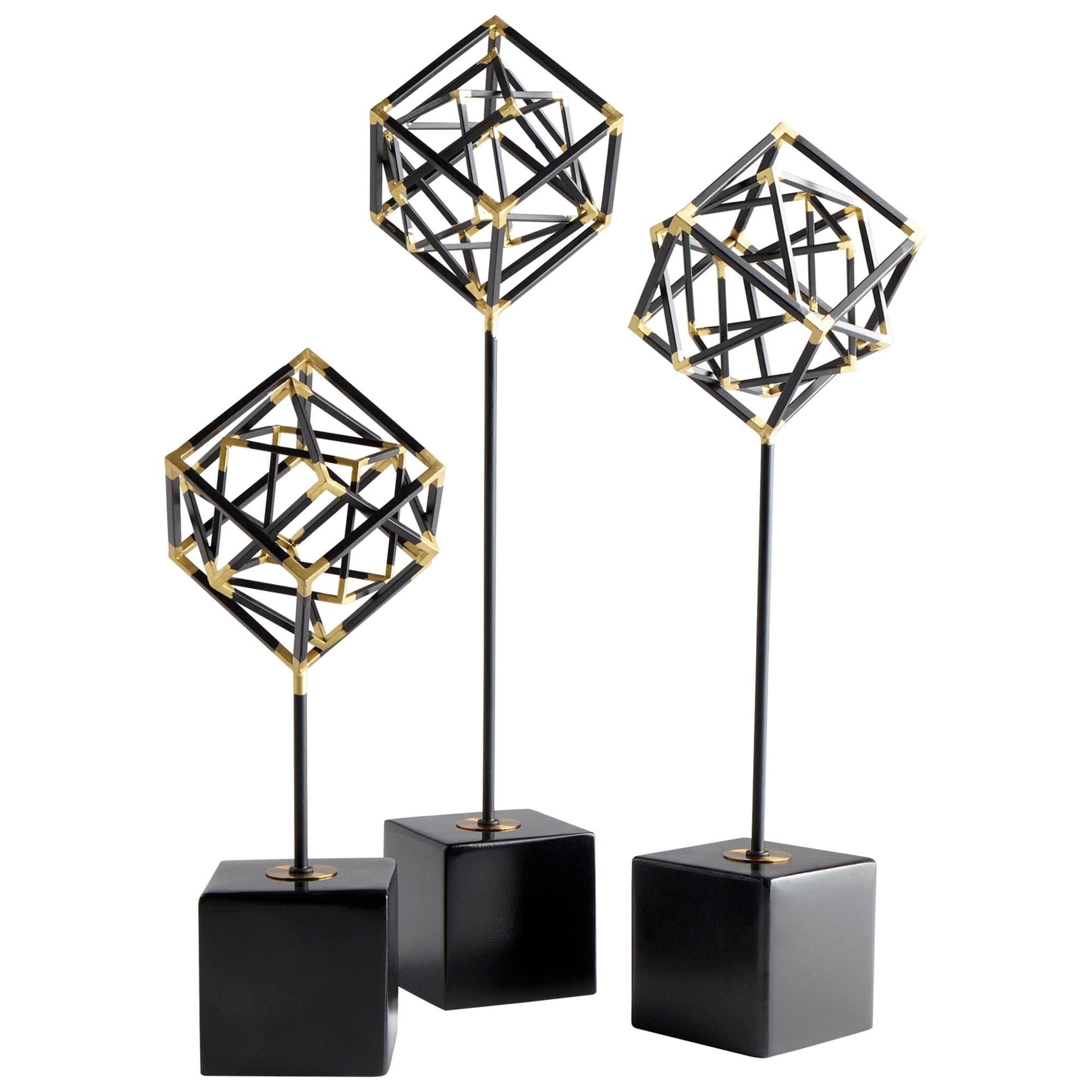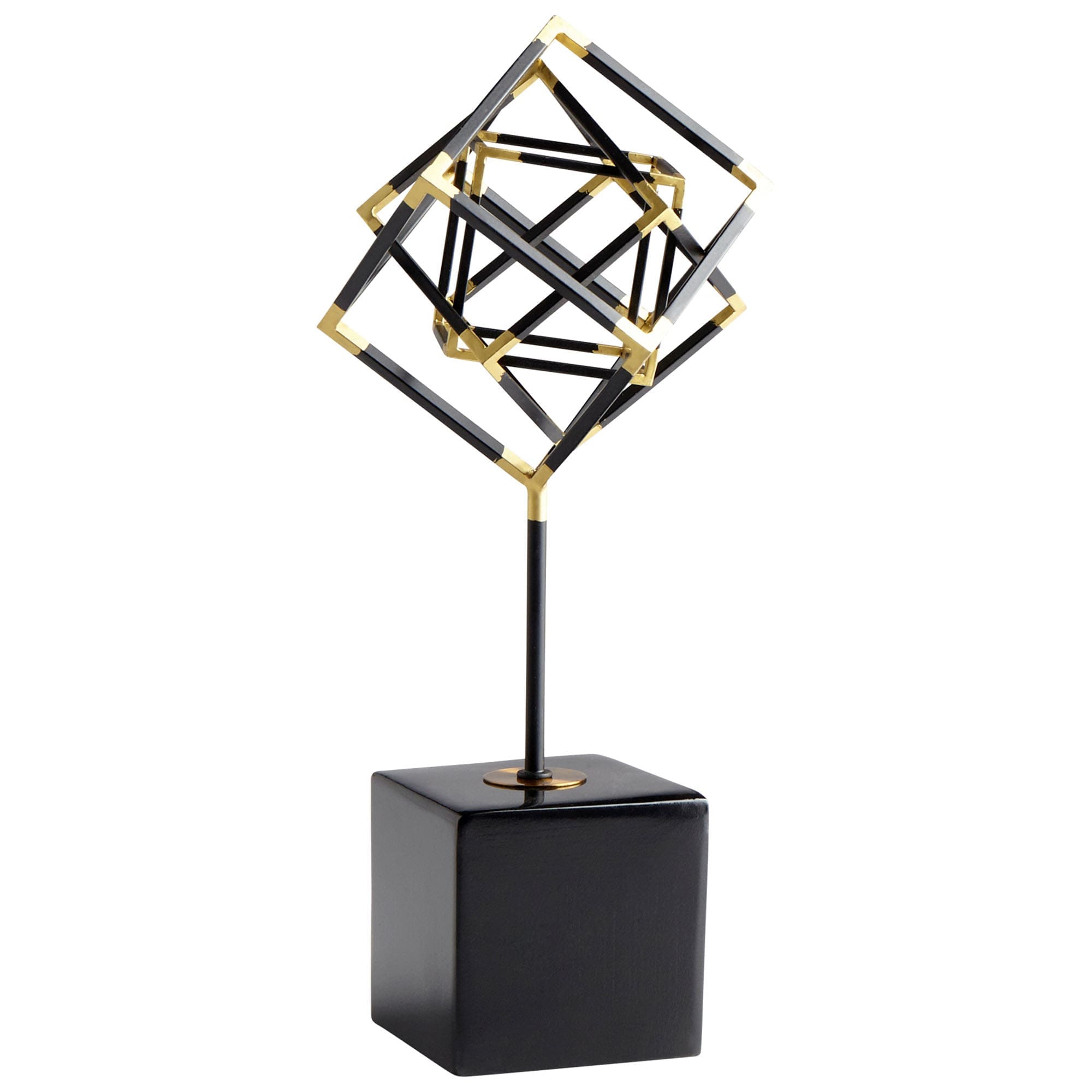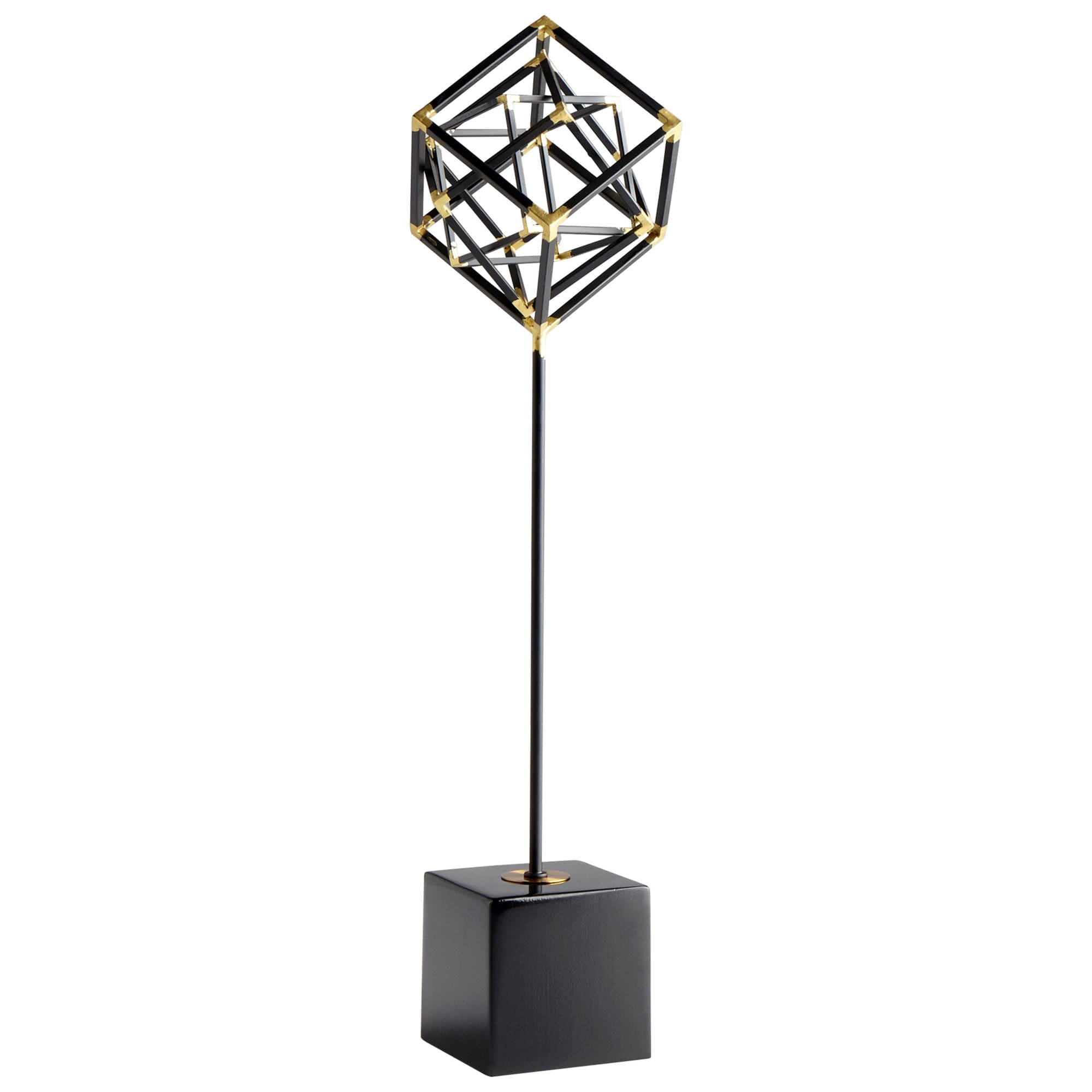 The Vault Collection is an unexpected sculpture that draws the eye upward. The Vault Sculpture is a perfectly square cube of multi dimensions. The Vault Cube is uniform from every angle with a unique design of a cube-inside-a-cube. The Vault Cube Sculpture offers texture from every direction. The Vault Statue is made of sleek wood and smooth iron metal in a black finish. Every joint of the Vault Cube Sculpture is finished with gold on the corners for added interest. The three dimensional Vault Cube is fastened to a slim rod and securely attached to a sturdy square cube. The Vault Cube Sculptures make a bold centerpiece when used as a group. Make a striking statement on your dining table or mantle with staggering heights of the Vault Cube. Each Cube Sculpture offers geometric flair to a desk or tabletop, taking on a different look from every angle. Available in three height choices; price shown is for one sculpture.