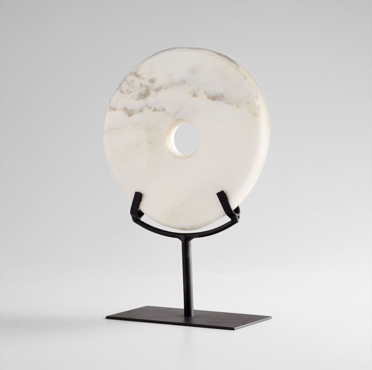 The White Marble Disk Sculpture is an ancient form with modern appeal. Carved from snowy white marble with gentle grey and gold veining, the simple stone disk rests in a custom black iron stand (included). Choose a large or medium sculpture for a commanding objet d’art, or display in pairs for maximum impact. The White Marble Disk Sculpture add an element of sophistication and luxury to contemporary or transitional interiors.