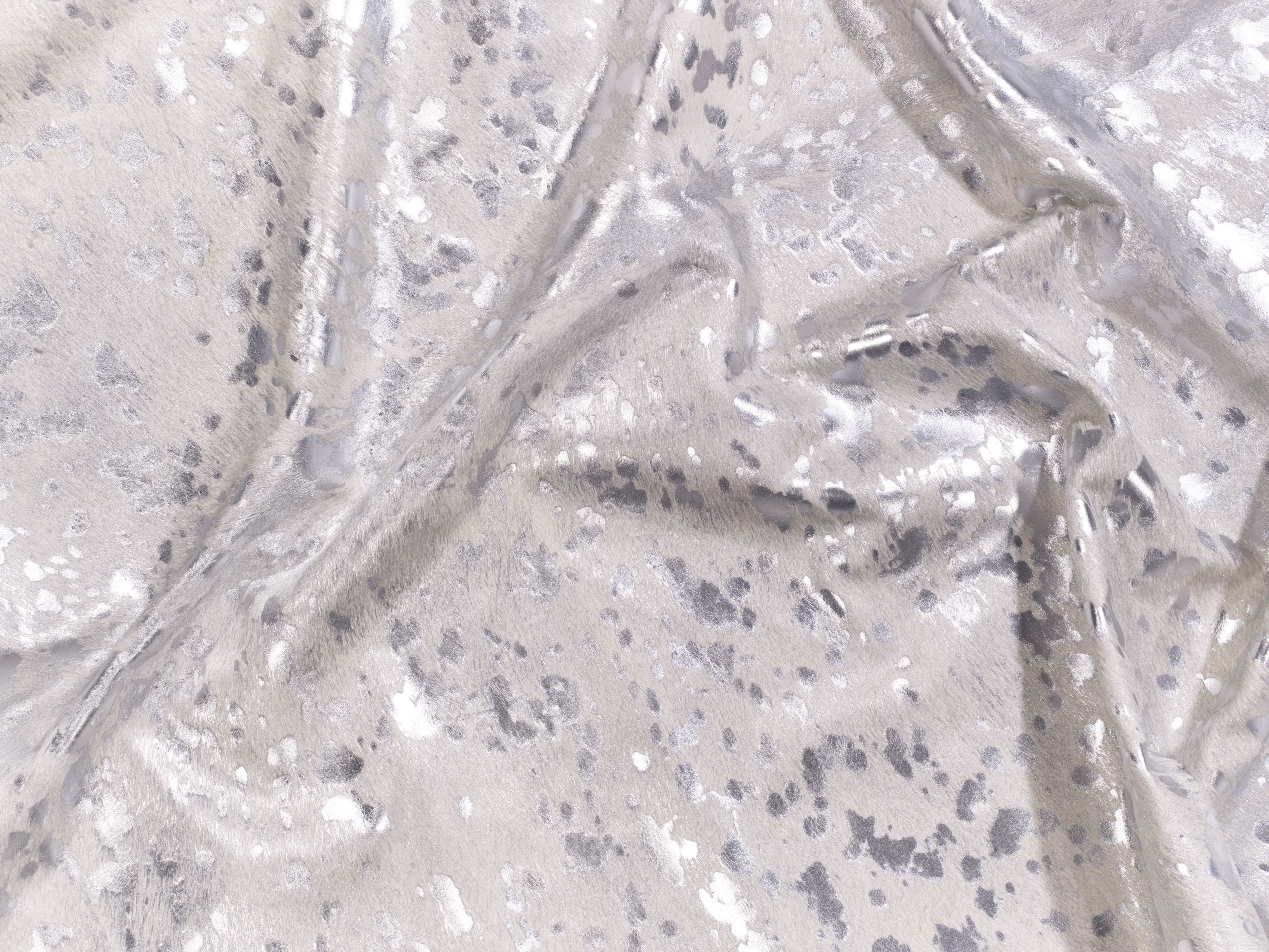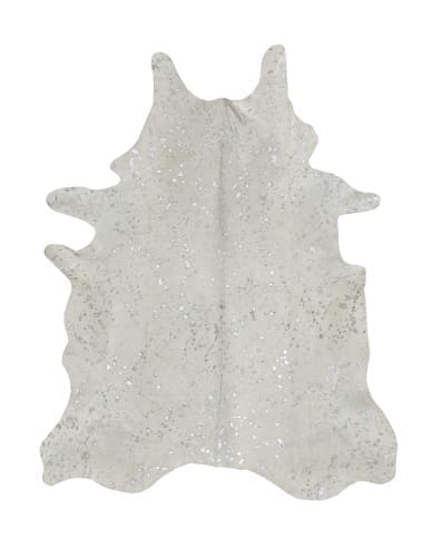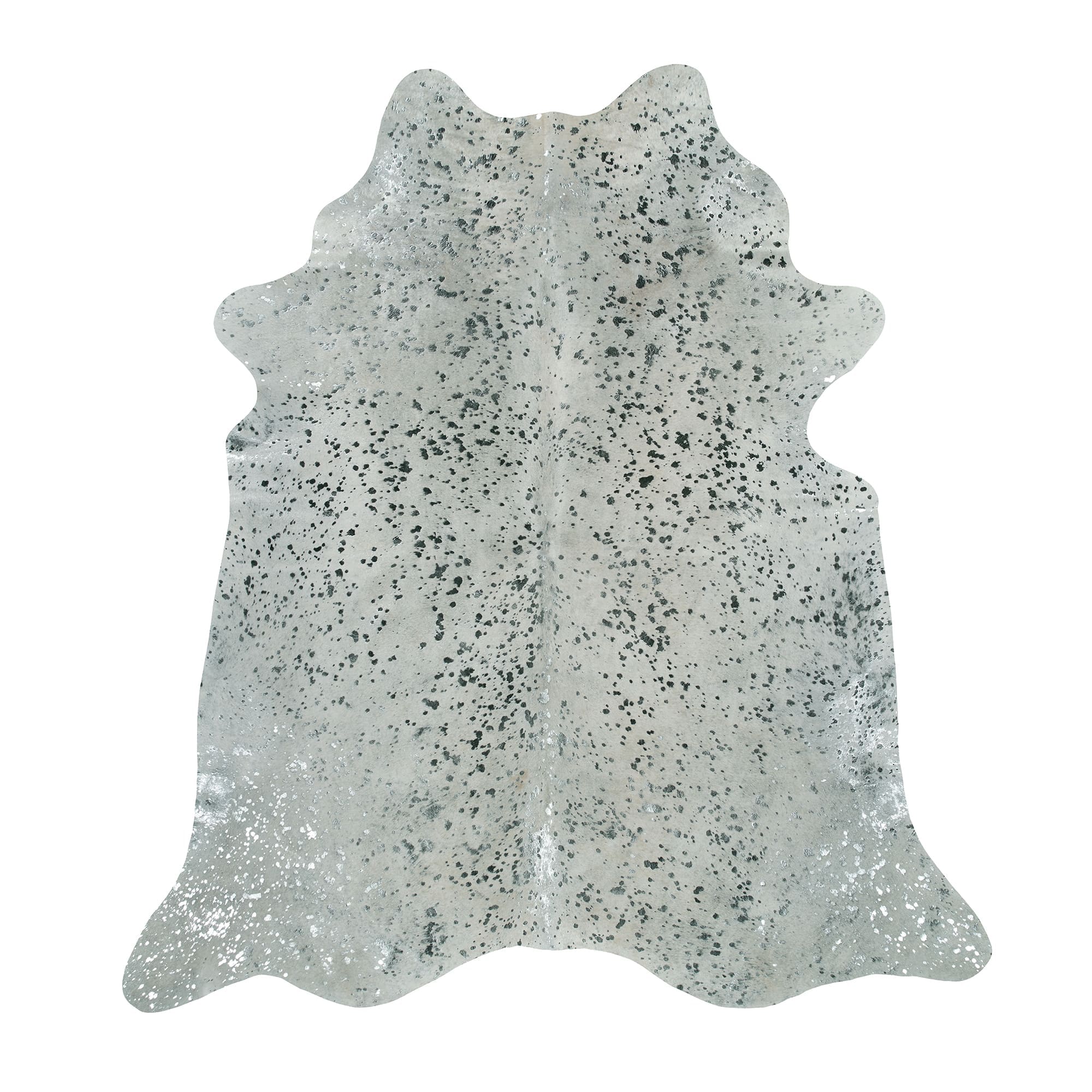 Our White with Silver Cowhide is the perfect solution for the high-style, high-octane home. The ruggedness and durability of real leather Brazilian cowhide make this rug virtually indestructible, while devore metallic silver accents make it unforgettable. Each rug is an original artwork, with avant-garde splatters of metallic silver foil paint across a textured natural surface. A specialty cowhide, this amply proportioned rug will anchor a seating arrangement in the living room, or lend softness to a bedroom. It’s irregular shape is an excellent solution for an odd-shaped space, or for offering a visual break to the clean lines of a modern design. Cowhides are great for homes with kids and pets, or for frequent entertaining where spills might otherwise be a challenge. Just wipe clean with a damp cloth as needed, and vacuum or shake out like a regular rug. Enjoy the low maintenance and enduring style of our White with Silver Cowhide.